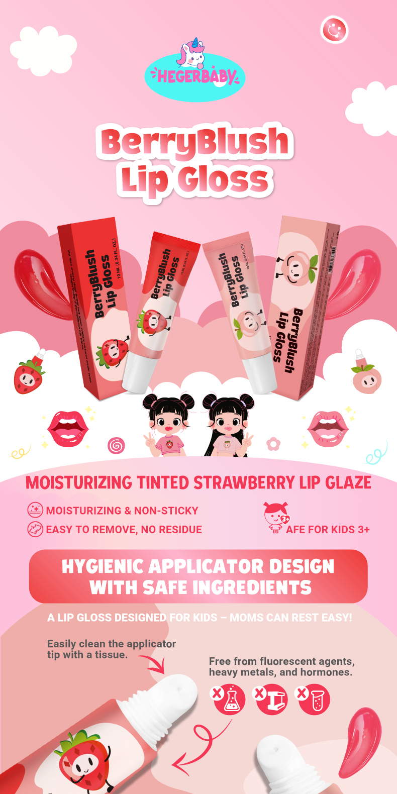 Experience the perfect blend of safety, comfort, and beauty with hegerbaby BerryBlush Lip Gloss!