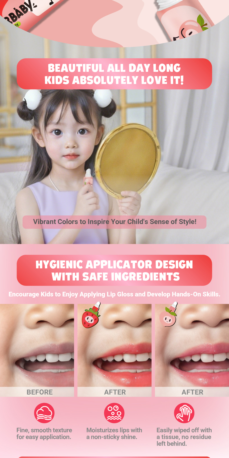 Step 3: Apply Directly - Use the applicator tip to evenly spread the lip gloss onto your child’s lips.